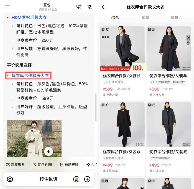 淘宝有最深的商品库,再长尾的商品也能搜到。而豆包倚靠抖音,具备丰富的内容库和10亿的月活数据,加上抖音电商的闭环加持,推荐颗粒度可达到「露营过夜怕冷」这种场景级需求,但短处是抖音电商的商品库远不及淘宝货架。
