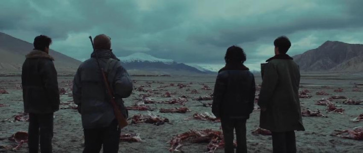 白菊和18岁巡山队少年冬智巴开车进山,车到半路,撞到一只死去的藏羚羊,两人下车才发现,四周到处都是被杀害的藏羚羊。