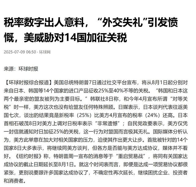《税率数字出人意料, “外交失礼”引发愤慨,美威胁对14国加征关税》2025-07-09 06:50·环球网