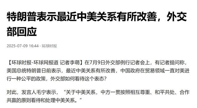 《特朗普表示最近中美关系有所改善,外交部回应》2025-07-09 16:44·环球时报